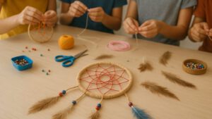 Wir verwenden Federn, Perlen und Garn, um unsere eigenen Traumfänger zu erstellen.