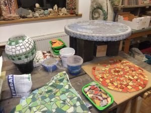 Aufbau von Skulpturen oder Objekten, Töpfern, Gips- und Betonarbeiten und verschiedene Mosaiktechniken.