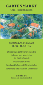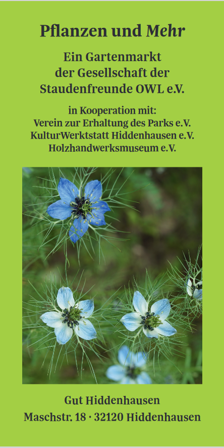 Jedes Jahr veranstaltet die Gelsellschaft der Staudenfreunde OWL e.V. zusammen mit den Vereinen auf Gut Hiddenhausen einen Gartenmarkt. Es gibt viele Stände um Pflanzen zu erwerben, sich beraten zu lassen oder auszutauschen. Sie können handgearbeitete schöne und nützliche Dinge für den Garten erwerben und sich mit süßen und herzhaften Speisen verwöhnen lassen.