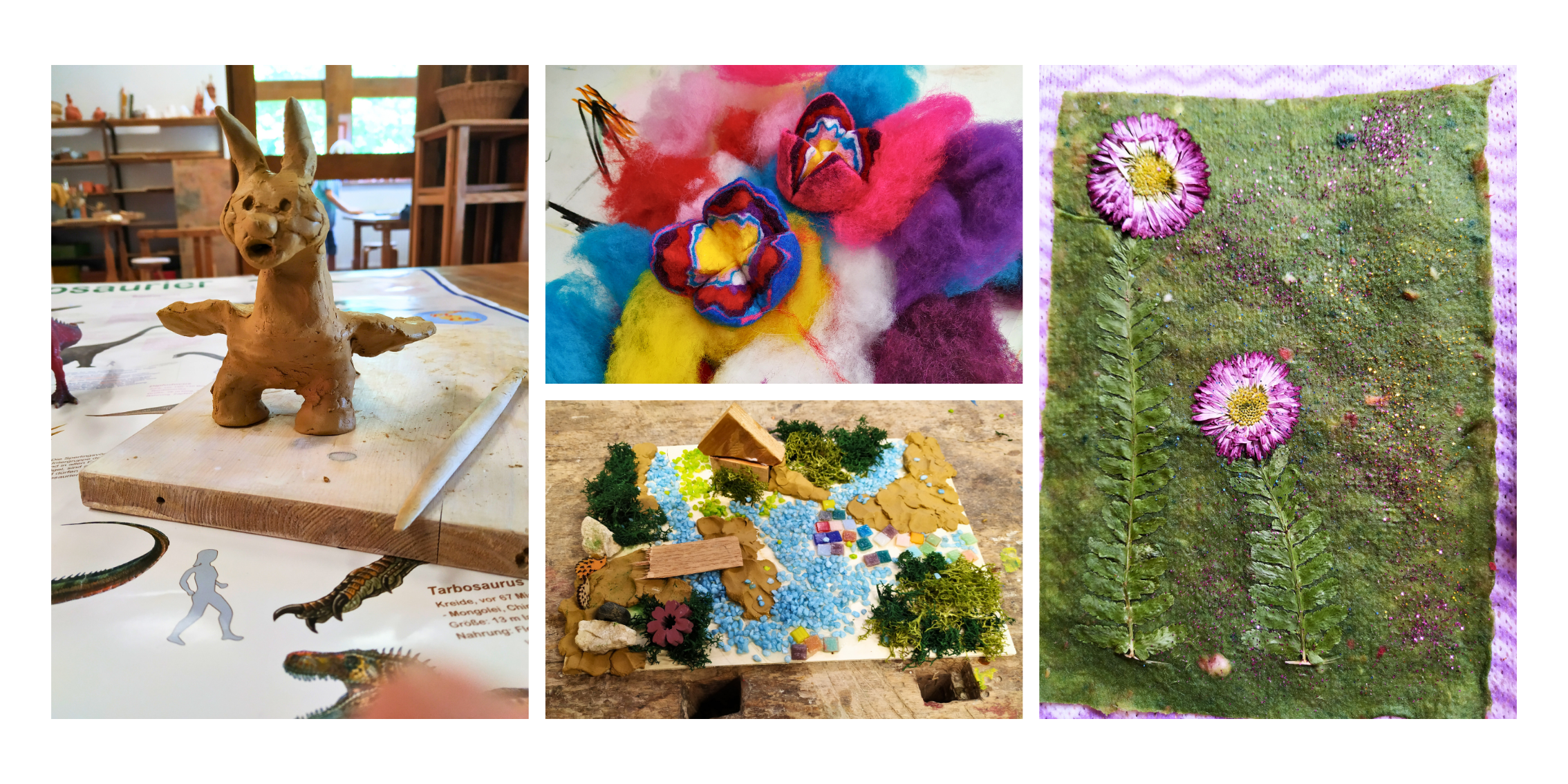 Tonwerkstatt und in der Holzwerkstatt. Mit Schafwolle wird gefilzt, aus Altpapier stellen wir